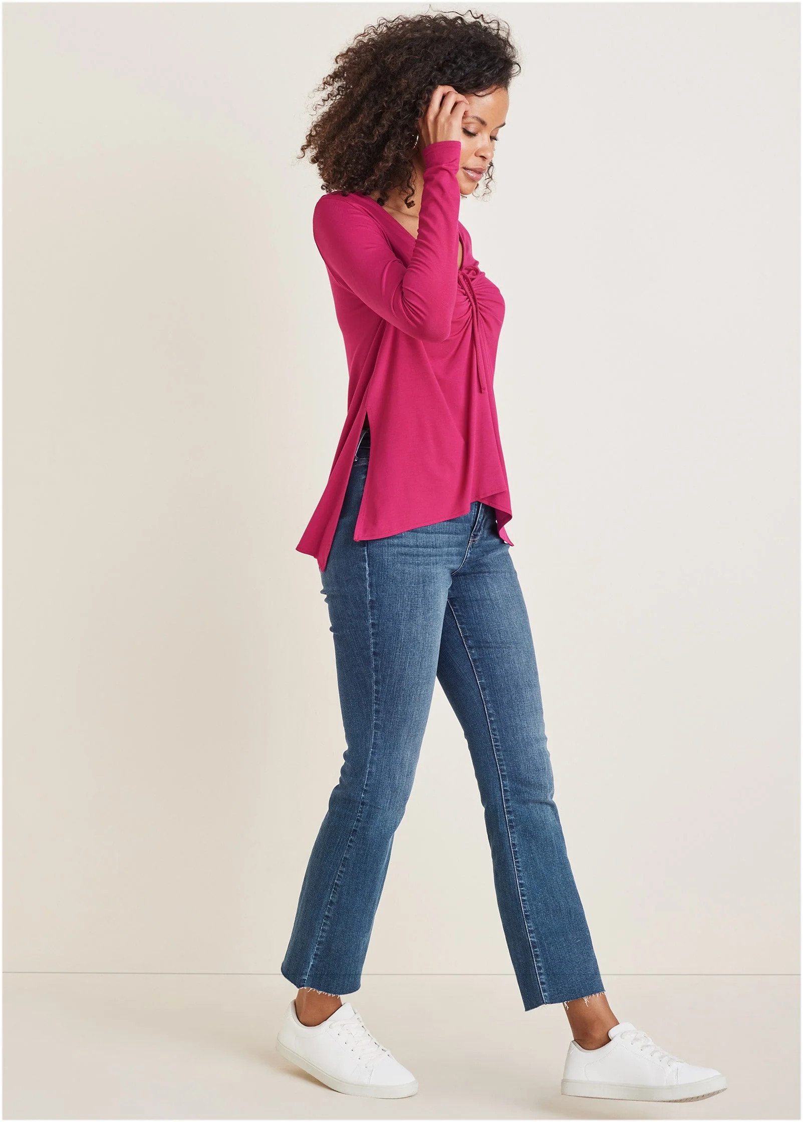 This flattering go-to blouse features an adjustable ruched front that adds volume where you want it. Crafted with soft flowy fabric and side slit details, it effortlessly drapes over your silhouette for a relaxed, yet chic look. The high-low front and back can be adjusted to fit your look perfectly!