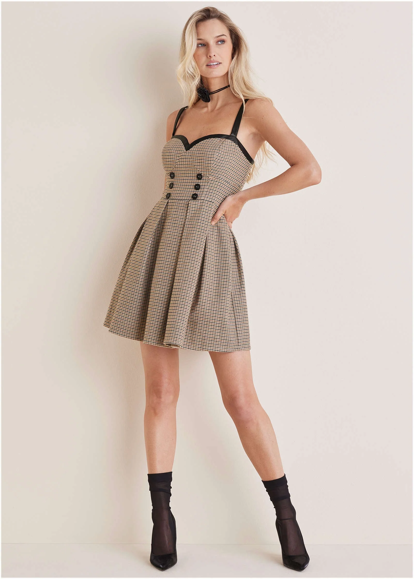 Plaid, but make it sexy. No really! The classic pattern shows off its alter ego in this flirty fit-and-flare mini dress. With a bustier-style top and buttery-soft faux-leather trim, this polished-yet-playful number has some serious spice. Style it with stiletto booties plus a bold choker to really nail the vibe.